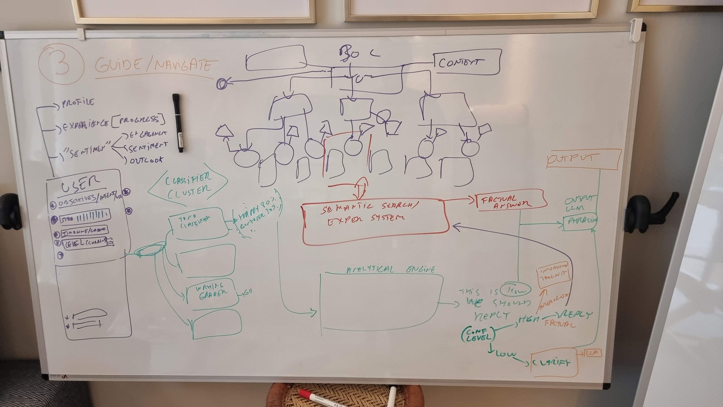 This is a whiteboard from early 2023 showing the components of the product at a high level: