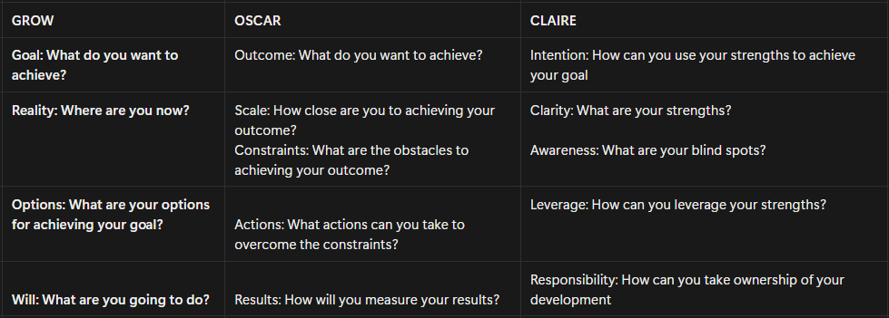 Did a bit of research about the methodologies the coaching world uses, learned a bit more about the GROW, OSCAR. CLAIRE frameworks.